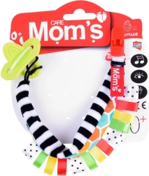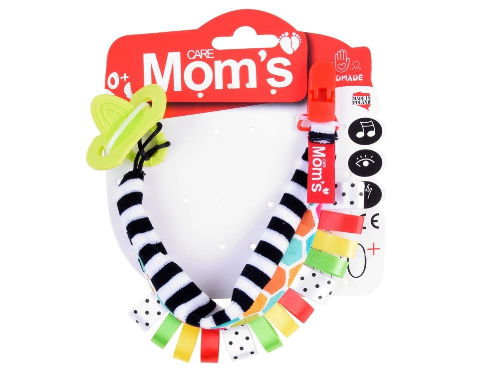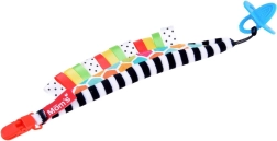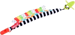 Soluție inteligentă pentru bebeluși încă de la naștere: clema pentru suzetă cu muștiuc combină fixarea sigură a suzetei cu stimularea senzorială. Dungile alb‑negre susțin percepția corectă a culorilor la cei mici, în timp ce etichetele colorate invită la explorare și antrenează degețelele.