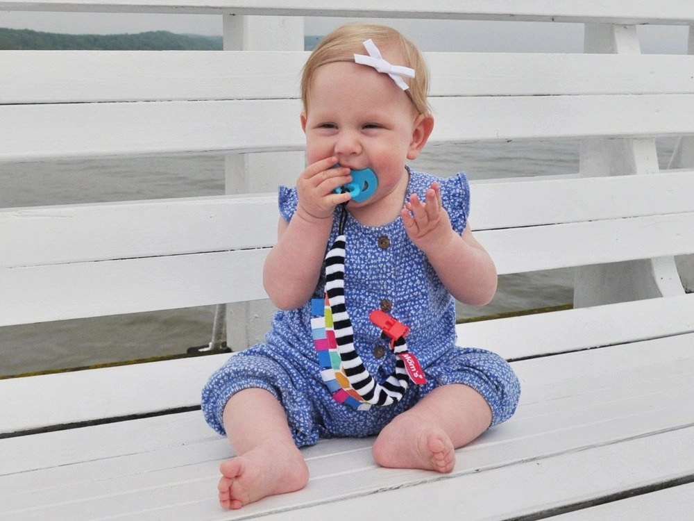 Clema rezistentă se prinde ferm de haine, iar banda textilă menține suzeta mereu aproape – acasă și în deplasare.