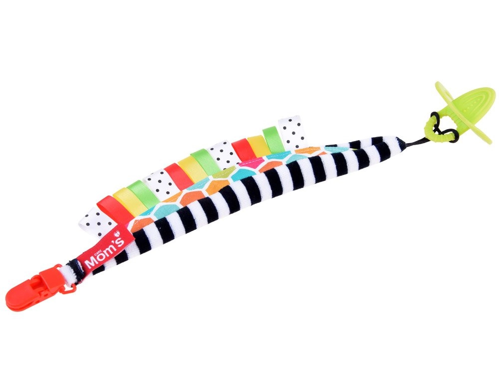 Clemă pentru suzetă cu muștiuc de la Hencz Toys, practică și sigură, păstrează suzeta mereu la îndemână și previne căderea ei. Banda textilă moale, cu model alb‑negru cu contrast ridicat și etichete colorate, susține percepția și motricitatea fină. Muștiucul din silicon oferă alinare în timpul erupției dentare, iar clema rezistentă se fixează sigur pe haine.