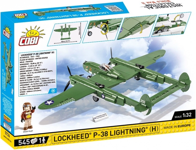Construiește legendarul avion de vânătoare american din Al Doilea Război Mondial – LOCKHEED P‑38 LIGHTNING la scara 1:32 de la COBI. Setul conține 545 piese, imprimări detaliate fără autocolante, elemente mobile (elve, flapsuri, tren de aterizare) și cabina deschizibilă cu o figurină de pilot. Licența oficială LOCKHEED MARTIN garantează redarea fidelă a iconicului „Cadru zburător”.