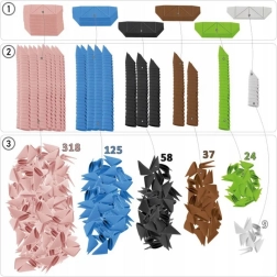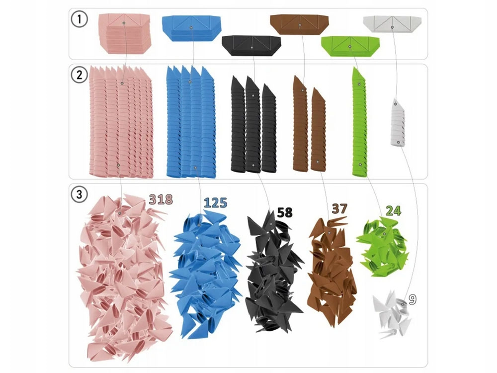 - module de hârtie, 2× picioare de hârtie pentru flamingo, 2× tije, 1× coală de autocolante, 1× instrucțiuni tipărite