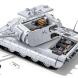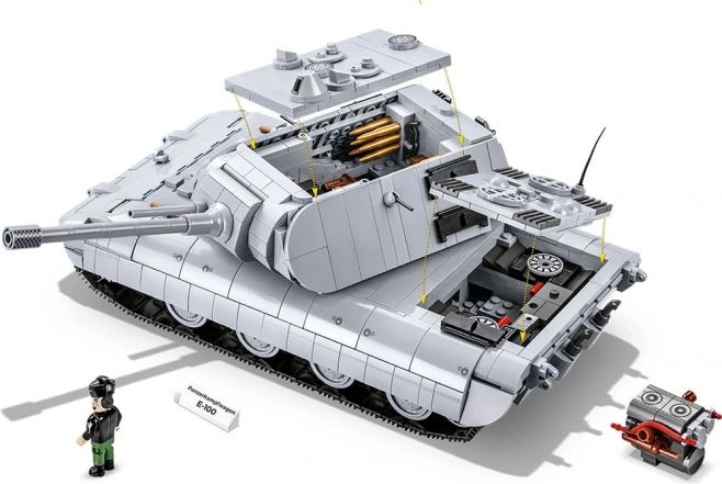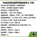 Acest model detaliat din seria de seturi istorice reprezintă prototipul german PANZERKAMPFWAGEN E‑100 de la sfârșitul celui de-al Doilea Război Mondial. Datorită scării mari, este finisat și în interior – deschide capacul de service, scoate motorul și aruncă o privire în turelă. Funcțiile realiste, precum turela rotativă, elevația tunului și șenilele funcționale, fac din acest model atât un exponat atrăgător, cât și un set jucabil.