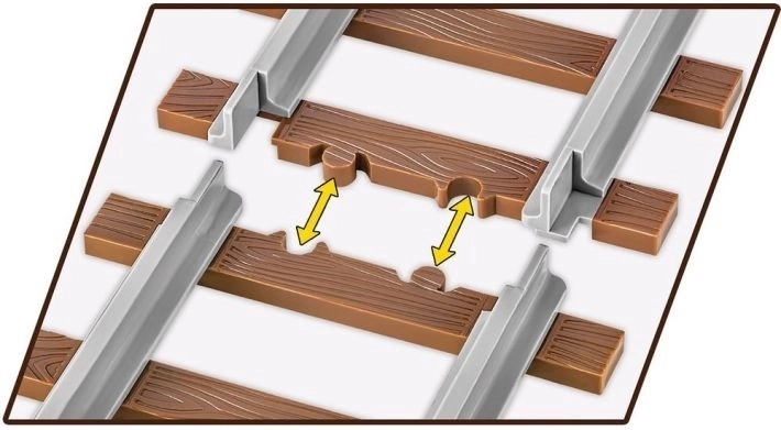 Setul include două plăcuțe interschimbabile cu numele locomotivei, dintre care puteți alege: germana BR 52 și poloneza Ty2. COBI a produs, de asemenea, o piesă specială care reproduce o secțiune de cale ferată. În set sunt disponibile cinci astfel de secțiuni cu o lungime totală de aproximativ 65 cm. Șinele sunt fabricate cu o tehnologie modernă de injecție bicoloră, ceea ce înseamnă că fiecare secțiune individuală de aproximativ 13 cm, care este un element monolit, este realizată din două culori diferite de plastic conectate între ele. Șinele gri, culoarea oțelului, se evidențiază clar față de traversele maro foarte realist redate. Pe fiecare traversă nu sunt vizibile țepi (pini), ceea ce le sporește realismul, iar fiecare este acoperită cu o textură de scânduri, imitând structura lemnului. Șinele pot fi fixate pe plăci de construcție și au o perforație tehnică, astfel încât pot fi atașate permanent la un dioram feroviar, de exemplu cu ajutorul unui șurub sau cui.