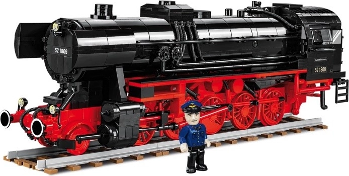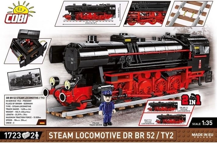Setul cu model din blocuri al locomotivei cu abur germane DR BR 52 / TY2 din al Doilea Război Mondial face parte din noua colecție Trenuri din oferta companiei COBI. Construcția reproduce fidel caroseria, proporțiile și detaliile legendarei locomotive cu abur, probabil cea mai îndrăgită și mai recognoscibilă pentru toți pasionații de cale ferată din lume. Ediția specială 2 în 1 include două seturi diferite de piese suplimentare care permit construirea modelului locomotivei germane DR BR 52 cu inscripționare germană din perioada celui de-al Doilea Război Mondial sau a locomotivei cu inscripționare poloneză a Căilor Ferate de Stat Poloneze din Polonia postbelică. Pe lângă diferitele piese cu simboluri imprimate, numerotări și marcaje distincte, setul conține și lămpi frontale și de capăt reproiectate, mai mari, pentru varianta poloneză, piese selectate în scheme de culori diferite și două minifigurine diferite: un mecanic german din perioada războiului și un mecanic polonez în uniformă PKP de după război, cu stema caracteristică – vulturul polonez cu coroana regală îndepărtată de comuniști.