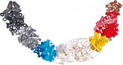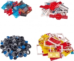 - Include 250 de piese potrivite pentru construirea de case și vehicule: uși, ferestre, părți de acoperiș, axe, șasiu și roți.