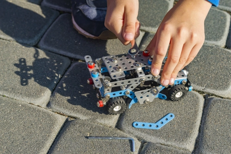 Asamblează un model detaliat cu elemente funcționale din piese metalice și din plastic. Ideal pentru copiii care adoră să creeze și să descopere principiile construcției.
