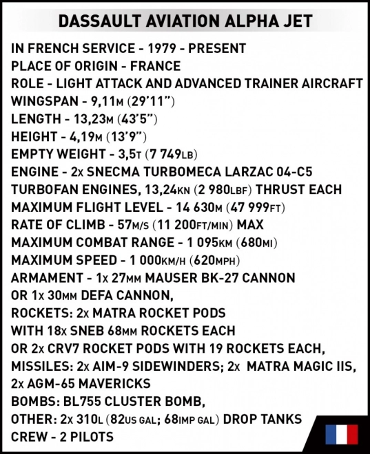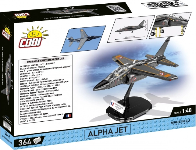 Alpha Jet este un avion de atac ușor și de antrenament avansat, dezvoltat prin cooperarea germano-franceză și a intrat în serviciu în anii '70. Acest model din piese a fost creat sub licența producătorului francez de avioane militare Dassault Aviation și completează colecția de modele Forțele Armate la scara 1:48.