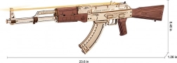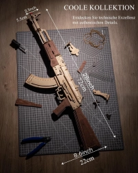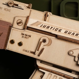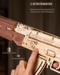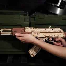 Modelul impresionează prin execuția precisă din lemn natural, gravuri laser și elemente mobile care simulează fidel mecanica unei arme reale.