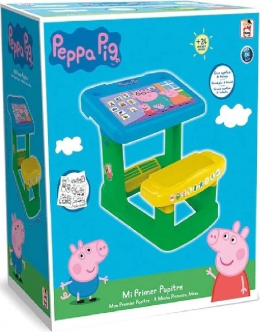 Dulce birou școlar cu motiv Peppa Pig este ideal pentru copiii care se pregătesc pentru primele experiențe școlare. Oferă un scaun confortabil, un compartiment practic pentru materiale de desen și creație și un suport pentru picioare pentru mai mult confort, totul realizat din plastic durabil.