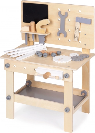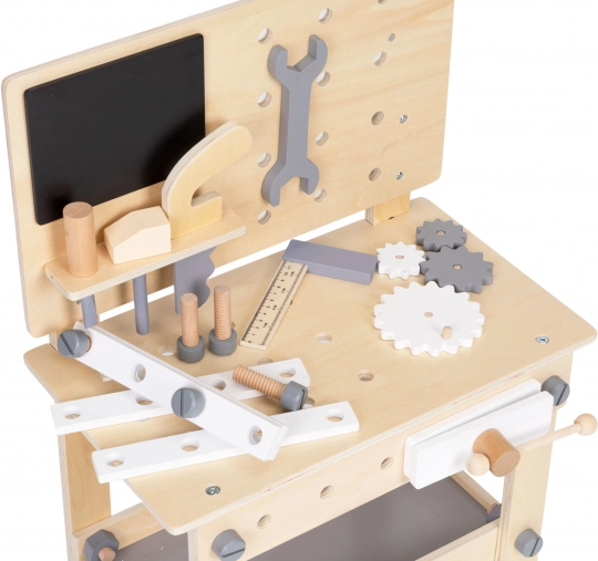Setul include o menghină funcțională și roți dințate antrenate, care îi învață pe copii principiile de bază ale transmisiilor. Uneltele și accesoriile sunt din lemn masiv, netede și vopsite cu culori sigure. Panoul superior perforat ajută la organizarea clară a uneltelor, iar tabla cu cretă este perfectă pentru notițe și schițe.