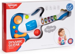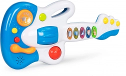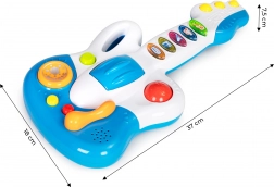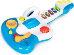Chitara este echipată cu 5 butoane colorate, fiecare cu un alt sunet sau melodie. O altă funcție atractivă este bila rotativă, care funcționează ca o zornăitoare.