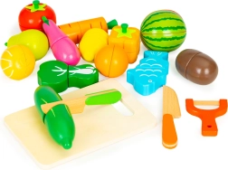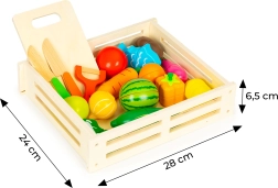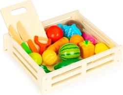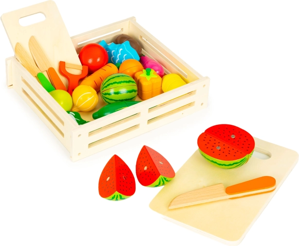 Datorită îmbinărilor magnetice, fiecare piesă poate fi „tăiată” în siguranță cu cuțitul din lemn și apoi reasamblată. Astfel, jocul dezvoltă motricitatea fină, coordonarea mână–ochi și învățarea prin imitație. Cutia din lemn practică facilitează depozitarea tuturor pieselor.