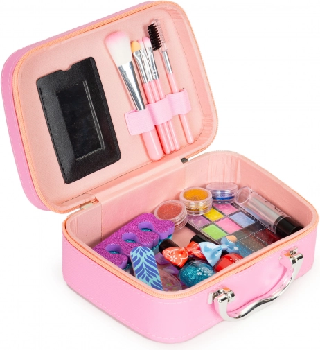 Machiaj magic pentru cei mici: un cufăraș practic cu oglindă, accesorii cosmetice sigure și ușor de spălat și lampă UV LED pentru unghii. Setul susține creativitatea și motricitatea fină și este un cadou grozav pentru copiii de la 3 ani în sus.