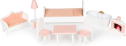Include 9 piese de mobilier din lemn colorate: lampă, pat, dulap, șemineu, masă, două scaune, canapea, cadă.