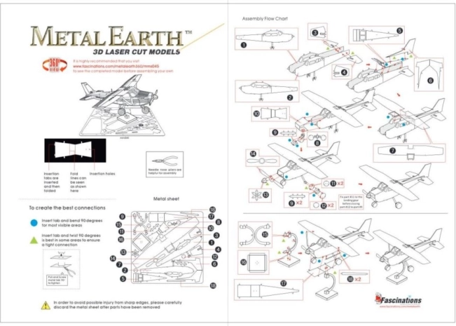 Scoateți piesele din foițele metalice; dacă este necesar, folosiți cleștișori de tăiat mici (neincluși). Piesele se îmbină între ele prin încuietori formate dintr-un cârlig (cioc) și un orificiu. Îndoiți cârligul folosind clești subțiri mici (neincluși) și îmbinați treptat toate încuietorile până obțineți o piesă de rezistență foarte realistă!