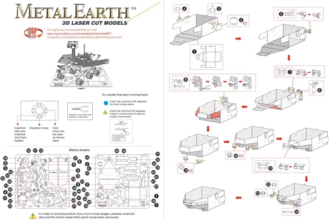 Pentru a asambla modelul, folosiți piesele din plăci de oțel (11 x 11 cm) și urmați instrucțiunile incluse. Piesele se îmbină folosind cleme și orificii. Recomandăm folosirea unor clești mici și subțiri, care nu sunt incluși în pachet.