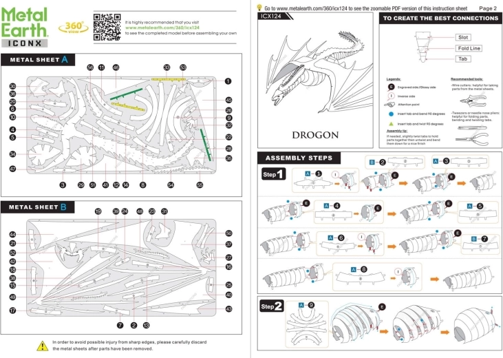 O provocare captivantă, plăcerea asamblării și un rezultat uimitor – acestea sunt modelele METAL EARTH! Modelul din gama premium ICONX Game of Thrones te va cuceri prin prelucrarea și mai rafinată a detaliilor! Asamblarea puzzle-ului 3D METAL EARTH ICONX necesită răbdare și îndemânare. Însă rezultatul compensează pe deplin efortul depus! Reproducerile miniaturale sunt o decorațiune deosebit de impresionantă și atrăgătoare nu doar acasă, ci și la birou sau la școală. Din foi dreptunghiulare de oțel (21 x 11 cm) cu piese reprezentând monumente mondiale, mijloace de transport celebre, instrumente muzicale sau animale, vei realiza modele fascinante, lucrate în detaliu. Aspectul autentic al puzzle-ului 3D METAL EARTH ICONX este obținut datorită gravării laser detaliate. Pachetul conține 2 foi de oțel și instrucțiuni de asamblare. Uneltele nu sunt incluse în pachet. PROCEDURĂ DE LUCRU: Scoate elementele din foile metalice; la nevoie folosește cleștișori tăietori mici (neincluși). Piesele se conectează prin încuietori formate dintr-un cârlig (limbă) și un orificiu. Îndoaie cârligul cu ajutorul unei perechi de clești subțiri mici (neincluși) și unește treptat toate încuietorile până când obții o piesă de măiestrie foarte realistă! Vârsta recomandată: de la 14 ani. Dimensiunea puzzle-ului asamblat: aprox. 21 x 19 x 4 cm