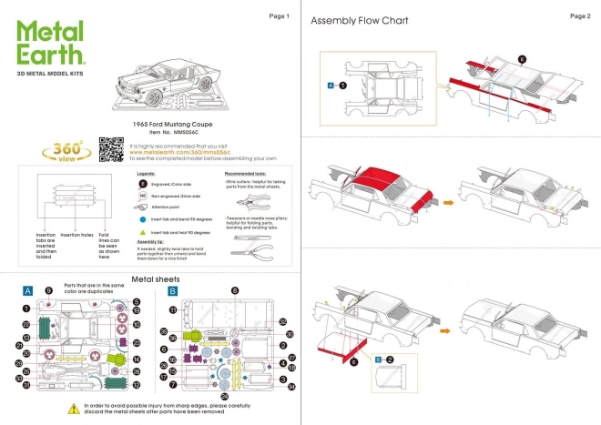 Provocare palpitantă, plăcerea asamblării și un rezultat sclipitor – acestea sunt modelele METAL EARTH! Modelul colecționabil al vehiculului Ford Mustang 1965 pentru toți iubitorii de mașini clasice. Asamblarea puzzle-ului 3D METAL EARTH necesită răbdare și îndemânare. Totuși, rezultatul muncii compensează pe deplin efortul depus! Mini-replicile sunt o decorațiune deosebit de impresionantă și captivantă nu doar acasă, ci și la birou sau la școală. Din plăcuțe pătrate de oțel (11 x 11 cm) va prinde formă în mâinile tale un model fascinant, realizat cu detalii minuțioase. Aspectul autentic al puzzle-urilor 3D METAL EARTH este obținut datorită gravării laser detaliate. Pachetul conține 2 plăcuțe de oțel și instrucțiuni de asamblare. Uneltele nu sunt incluse în pachet. PROCEDURĂ DE LUCRU: Scoateți piesele individuale din plăcuțele metalice; la nevoie folosiți cleștișori tăietori mici (nu sunt incluși). Piesele se îmbină între ele cu ajutorul unor îmbinări formate din cârlige (cioc) și orificii. Îndoiți ciocul cu ajutorul unor clești subțiri mici (nu sunt incluși) și uniți treptat toate îmbinările până când ia naștere o piesă de rezistență extrem de realistă! Vârsta recomandată: de la 14 ani. Dimensiunile puzzle-ului asamblat aprox. 8,5 x 4,2 x 4,5 cm