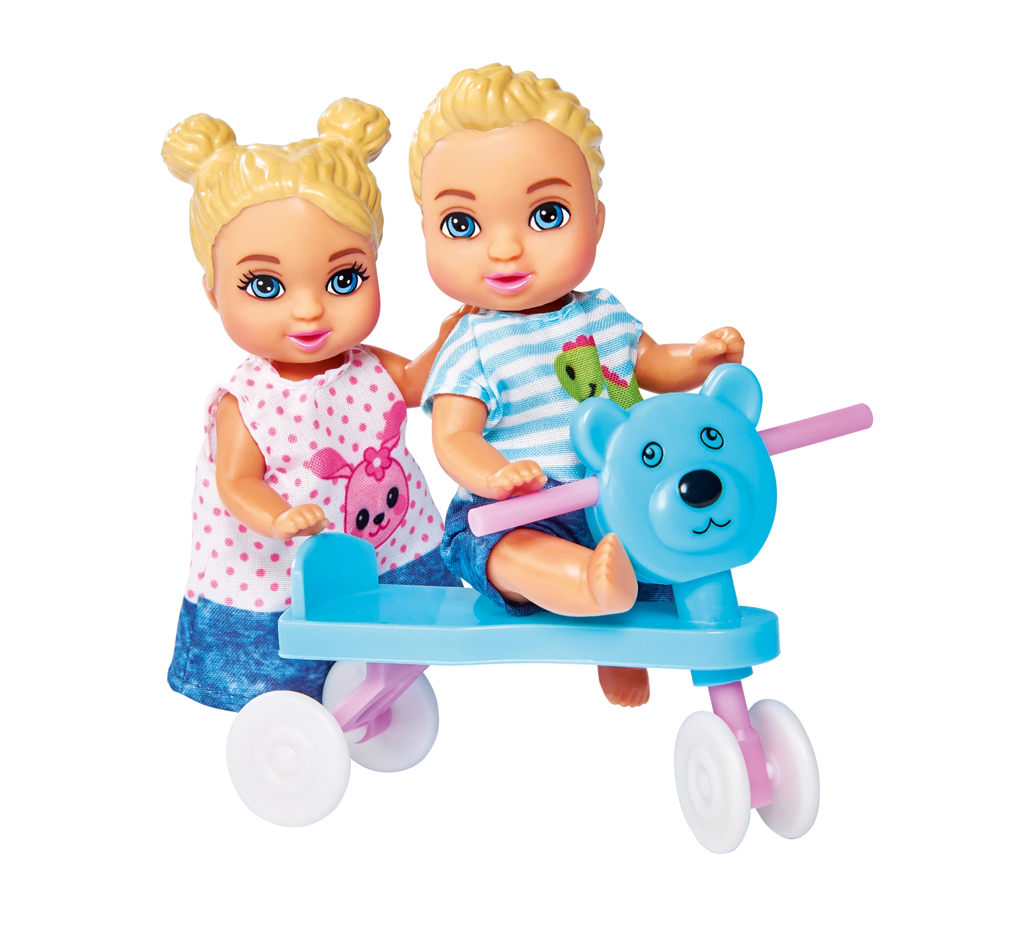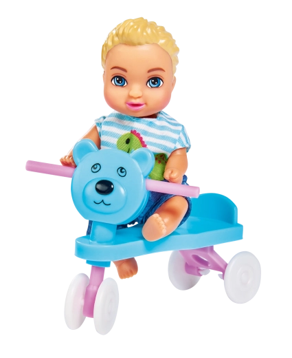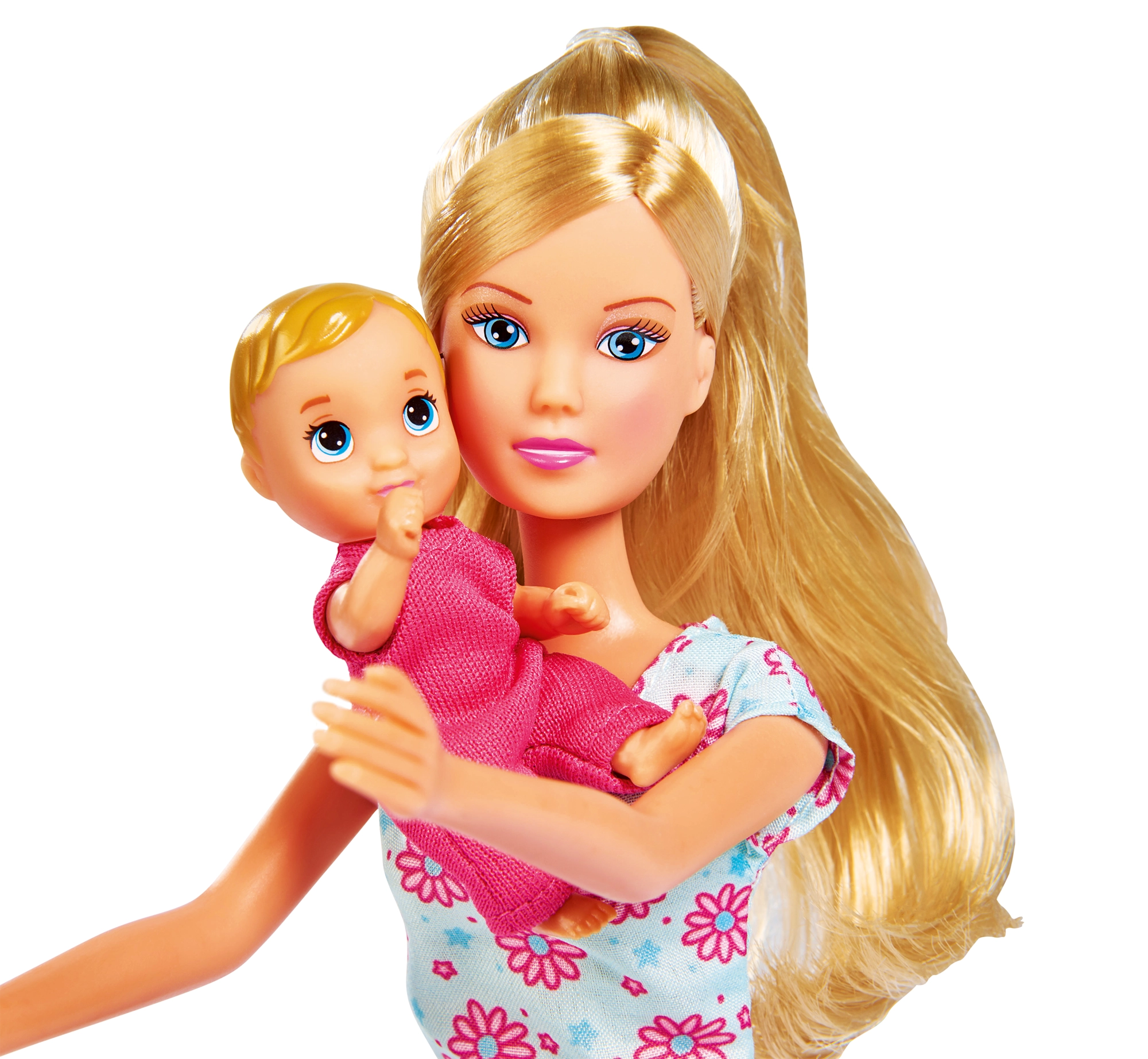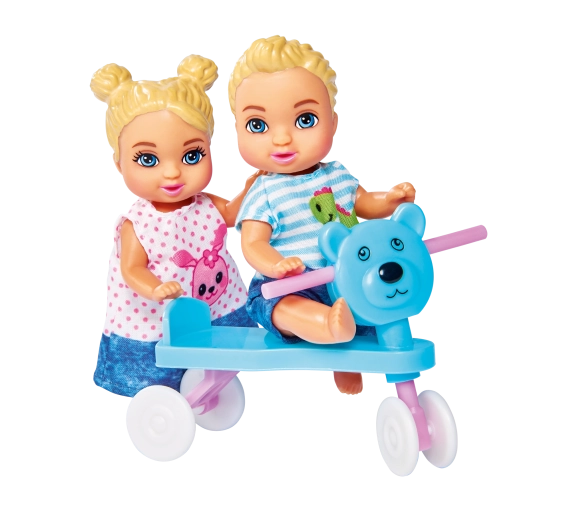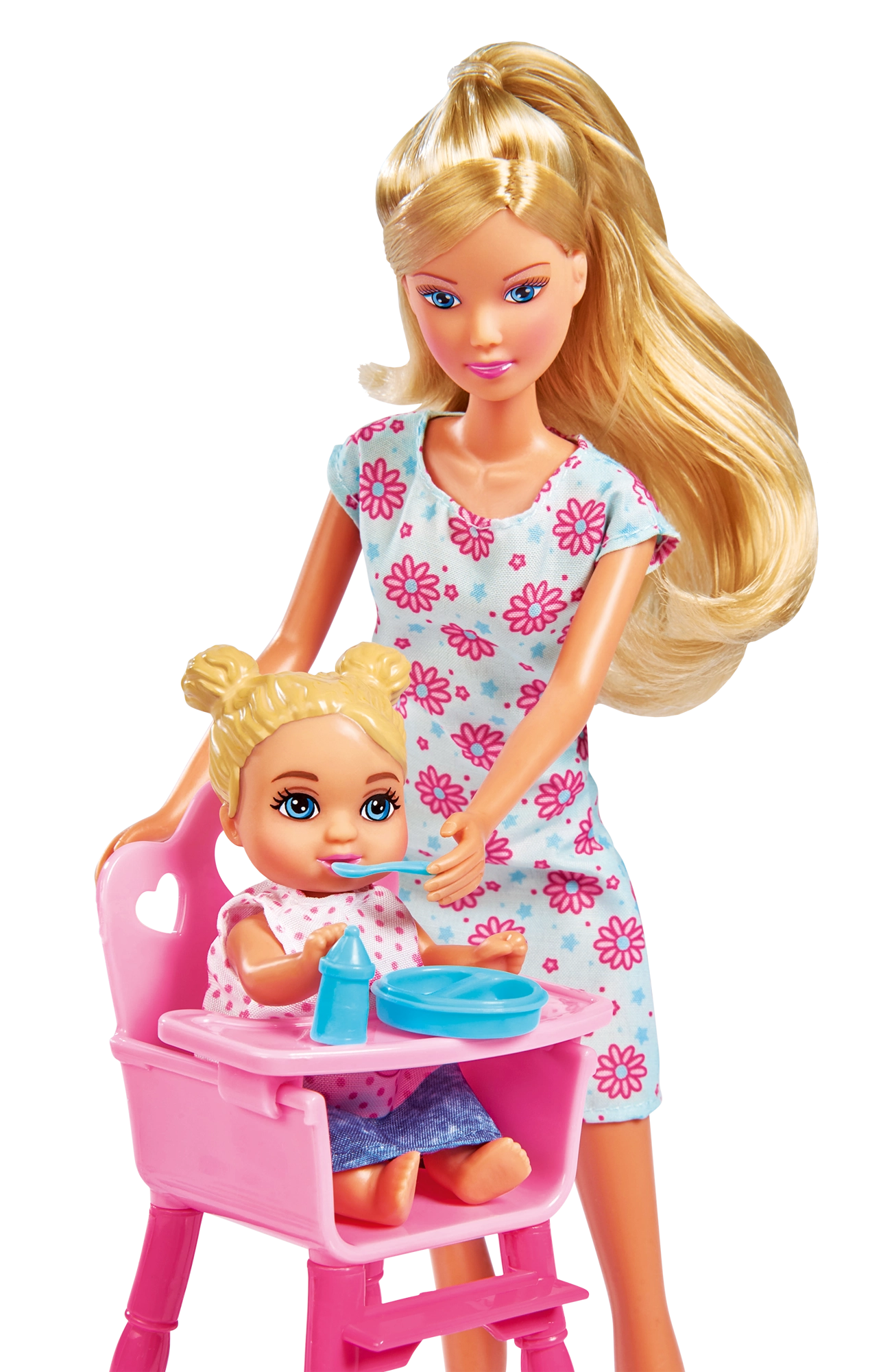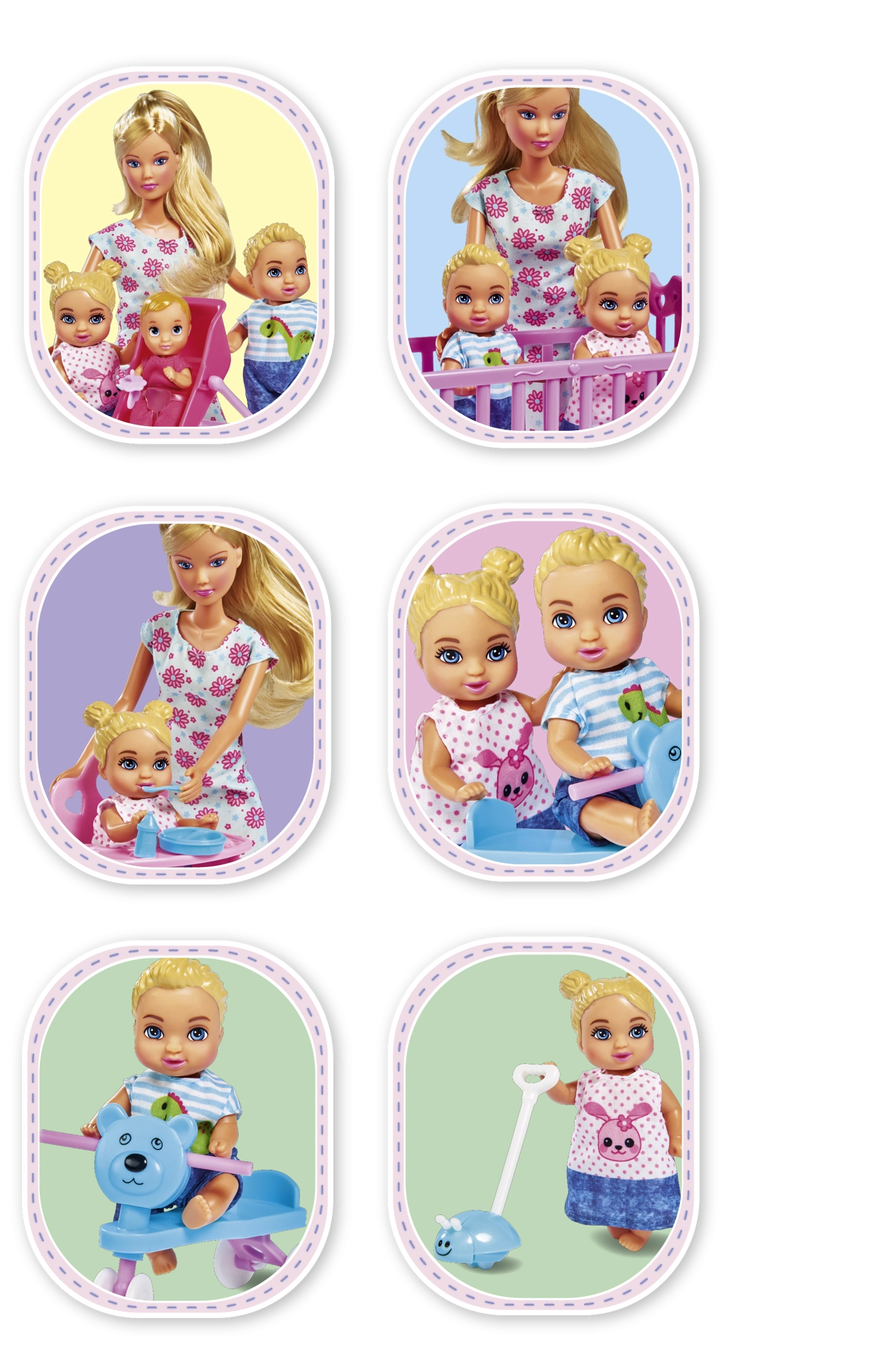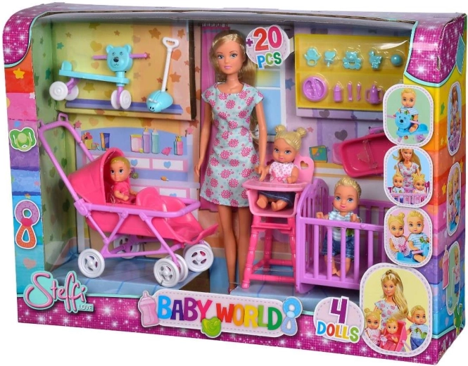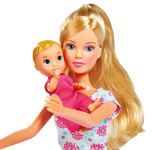 - Păpușa Steffi (mămică), 3 bebeluși, pătuț/leagăn, scăunel de masă, cărucior 2 în 1, port-bebe, trotinetă/vehicul de împins, jucării și accesorii pentru hrănire (biberon, bol, tacâmuri), suzetă, jucării de dentiție