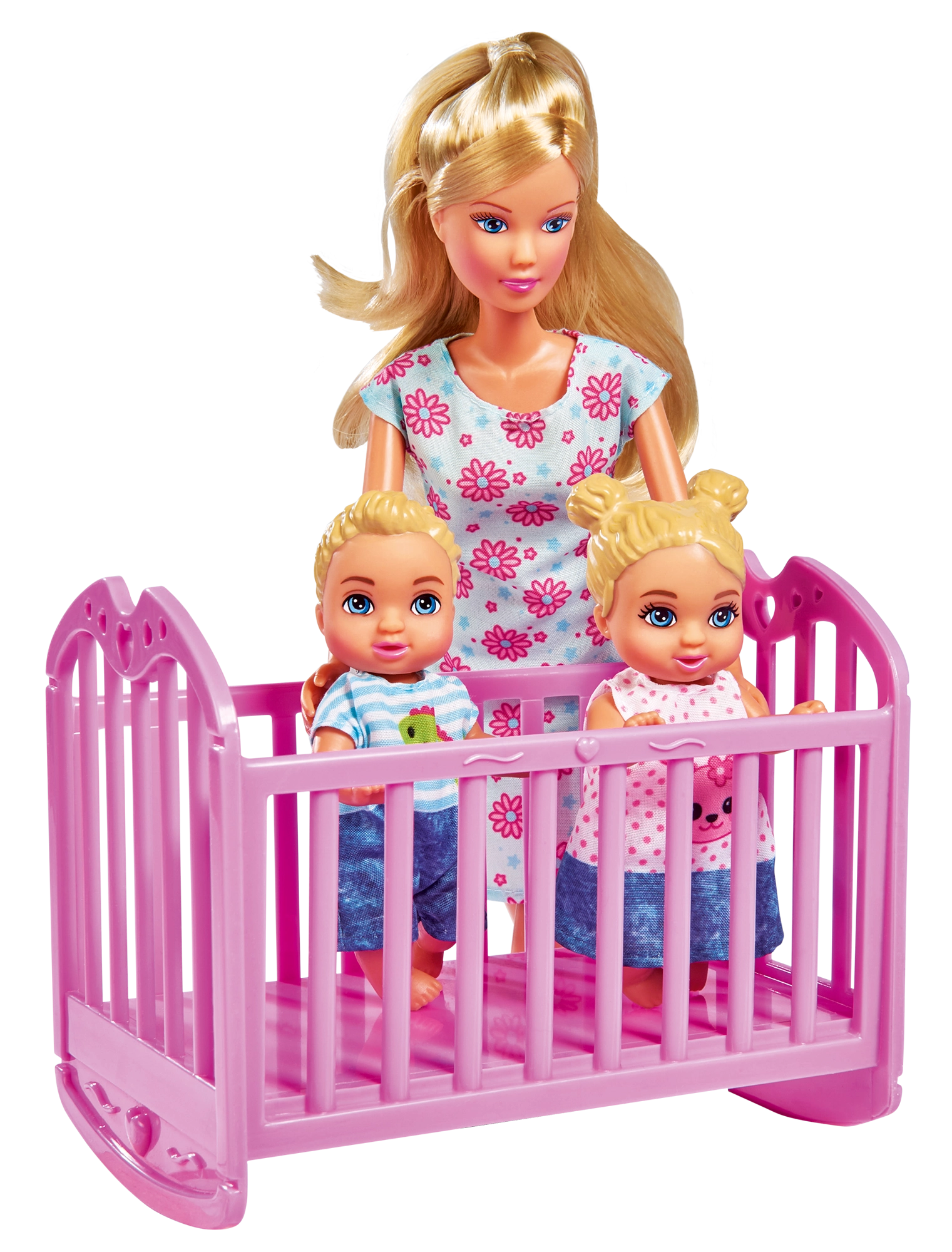 Îndrăgita păpușă STEFFI se prezintă ca o mămică grijulie cu trei bebeluși și un set bogat pentru camera copiilor. Datorită căruciorului 2 în 1 (landou + variantă sport), pătuțului, scăunelului de masă și accesoriilor practice, copiii pot juca toate situațiile cotidiene – de la hrănire și adormire până la plimbări.