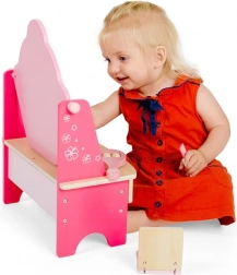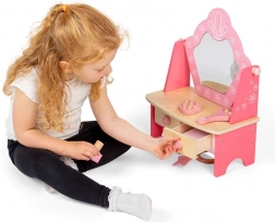 Această elegantă măsuță de toaletă roz va încânta toate micile cochete. Datorită lemnului de calitate și finisajului atent, este stabilă și sigură, iar detaliile florale delicate adaugă farmec camerei copilului. Oglinda ușurează ritualurile zilnice, iar cele două sertare oferă suficient spațiu pentru toate comorile.