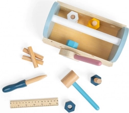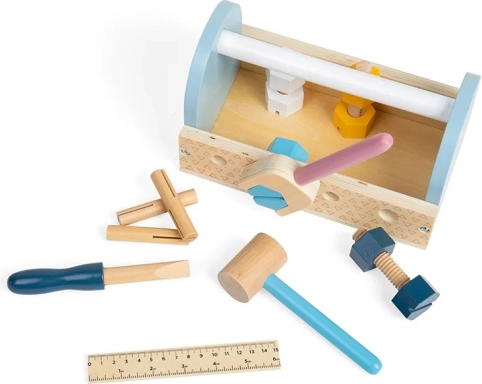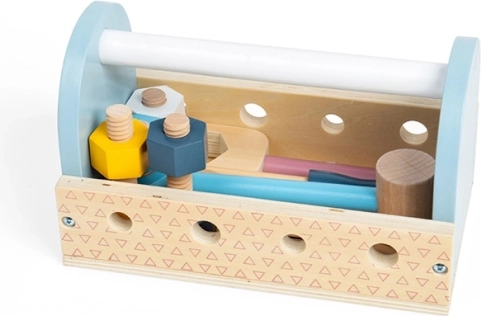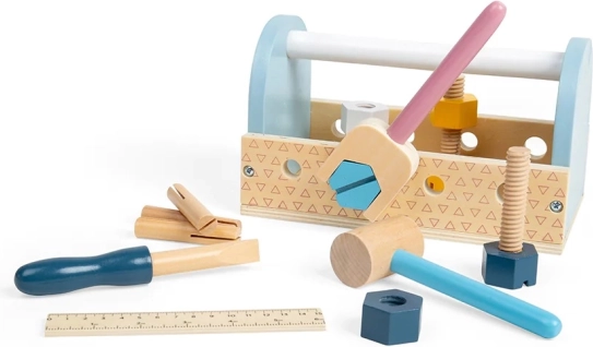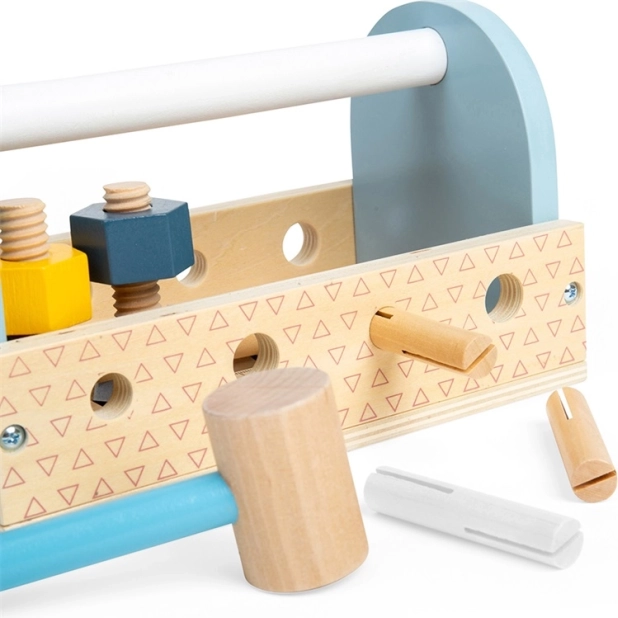 Cutia de transport din lemn cu unelte este alegerea ideală pentru primele aventuri de reparații. Copiii pot bate, strânge și măsura, iar în timpul jocului își dezvoltă coordonarea mână–ochi, răbdarea și vocabularul. Dimensiunile compacte și mânerul practic permit luarea setului oriunde.