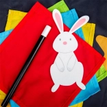 - Geantă de magician, pelerină cu imprimeu stelar, baghetă din lemn, cărți, 3 pahare din plastic, pălărie din pâslă, iepuraș, 6 jetoane din plastic, 4 eșarfe