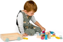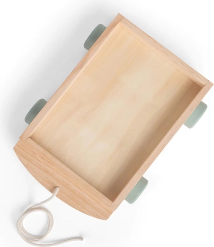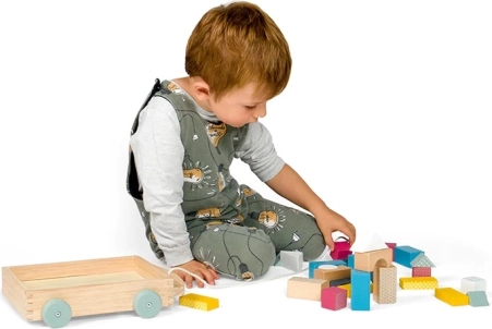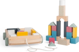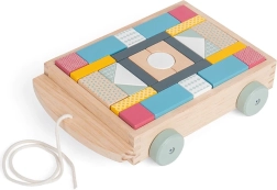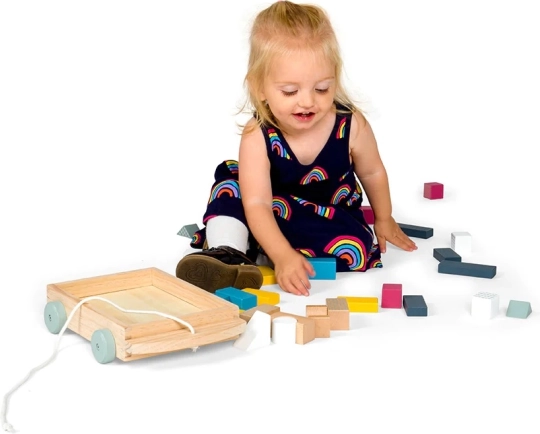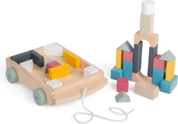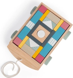 Căruciorul din lemn cu 29 de cuburi colorate în nuanțe pastel moderne este un ajutor excelent pentru primele construcții, sortare și învățare. Cuburile au dimensiuni plăcute, se țin ușor în mână și se pun la loc în cărucior, care poate fi tras ușor datorită șnurului rezistent. Jucăria contribuie la dezvoltarea echilibrului, coordonării și imaginației.