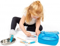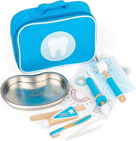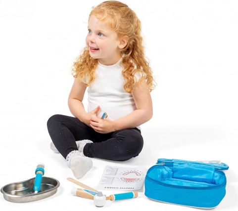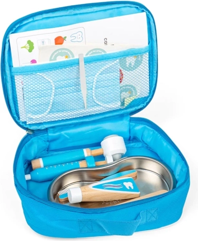 Eleganta servietă albastră ascunde tot ce are nevoie un mic dentist: periuță de dinți din lemn, tub pentru pastă de dinți, seringă, otoscop, pensetă, mască, tăviță din inox, autocolant și un ghid pentru periaj corect. Copiii pot exersa în siguranță ce îi așteaptă la dentist și își formează în mod natural un raport pozitiv cu igiena orală.