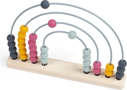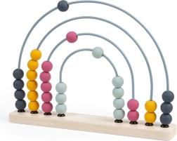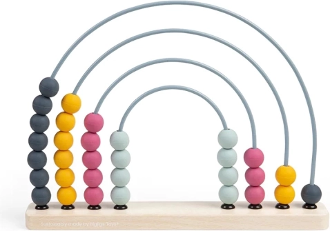 Baza este realizată din lemn certificat FSC®, arcurile din metal, iar bilele din silicon de calitate alimentară. Datorită culorilor pastel atemporale și formei de curcubeu, se potrivește și ca accesoriu de design. După joacă poate decora raftul și continua să invite la descoperirea numerelor.