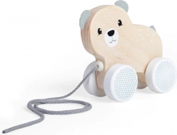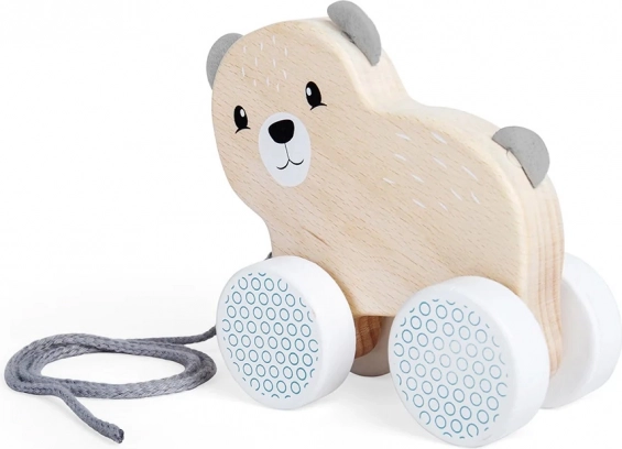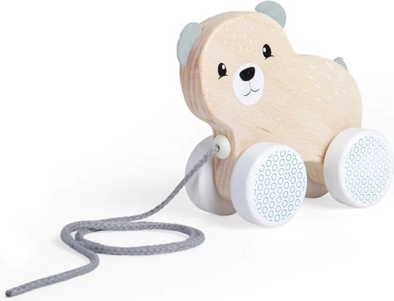 Acest ursuleț din lemn, de tras, cu urechiușe și codiță din fetru, îi motivează pe copii să se miște și dezvoltă coordonarea mână–ochi și motricitatea grosieră. Datorită dimensiunilor compacte se ține ușor în mână și rulează lin pe suprafețe drepte.