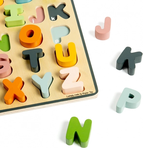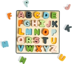 Puzzle-ul din lemn cu 26 de litere viu colorate este un instrument perfect pentru primele întâlniri cu alfabetul. Fiecare literă are decupajul său în culoarea corespunzătoare, ceea ce le facilitează copiilor memorarea și asocierea corectă. Datorită pieselor solide și ușor de prins, copiii își antrenează coordonarea mână–ochi și concentrarea.