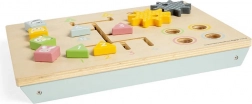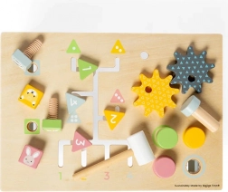 Masa include o serie de activități care susțin dezvoltarea timpurie: copiii pot bate țărușii cu ciocănelul din lemn, pot încerca să strângă șuruburile filetate cu capete de animăluțe, pot roti roțile dințate din lemn sau pot introduce triunghiurile numerotate în deschiderile corecte. Jucăria este fabricată din lemn FSC® obținut în mod etic și respectă standardele europene actuale de siguranță.