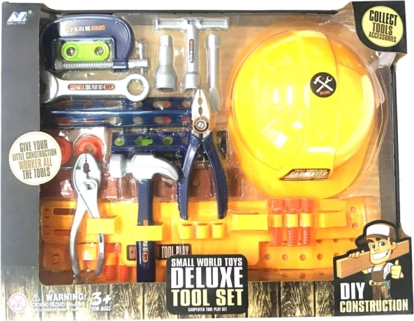 Include o gamă largă de instrumente precum ciocan, cască și șurubelnițe, toate fabricate din plastic pentru utilizare sigură.
