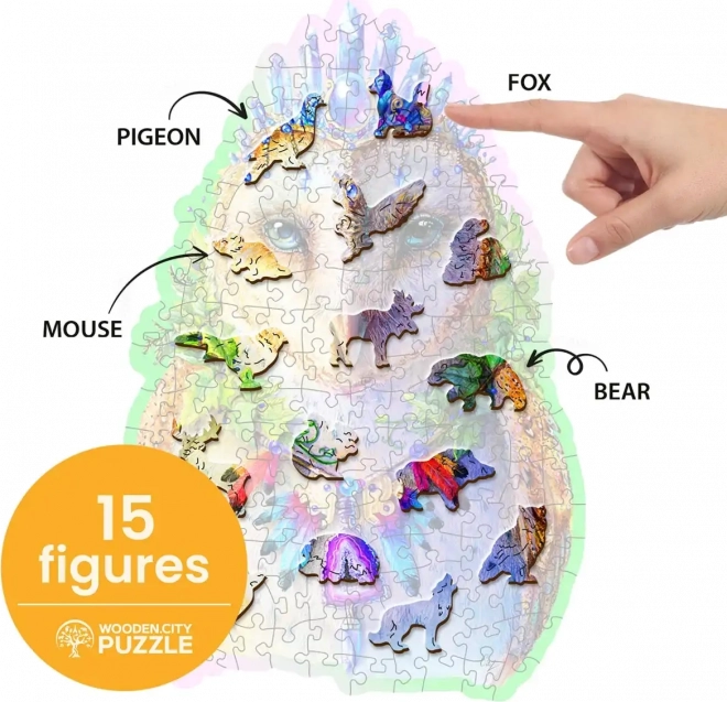 Puzzle din lemn Bufnița Frumoasă de la WOODEN CITY oferă distracție nesfârșită cu piesele sale unice în formă. Creați și descoperiți cu piese în formă de animale, care pot sta ca figuri independente.