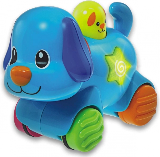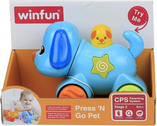 Drăgălaşul căţel interactiv, în culori vii, îi motivează pe copii să se mişte şi să exploreze. Ajută la dezvoltarea văzului, auzului, tactilului şi a motricităţii fine şi grosiere. Ideal pentru copiii care încep să se târască – la apăsarea butonului mare, căţelul porneşte, clipeşte, redă melodii vesele şi clatină căpuşorul.