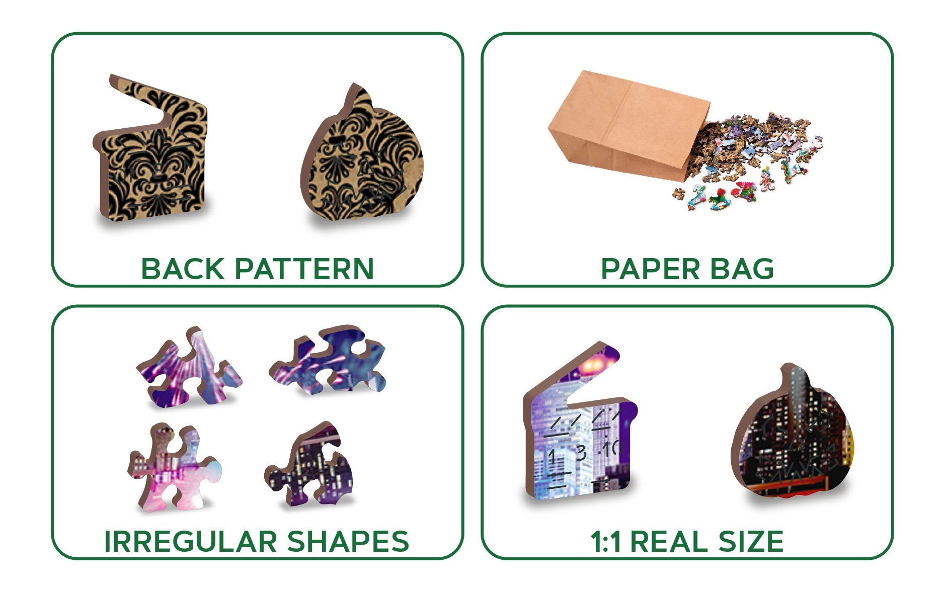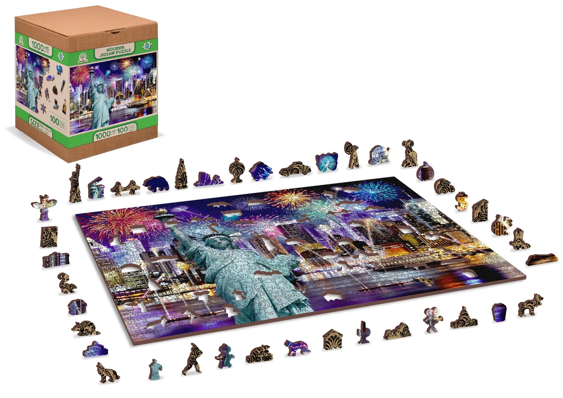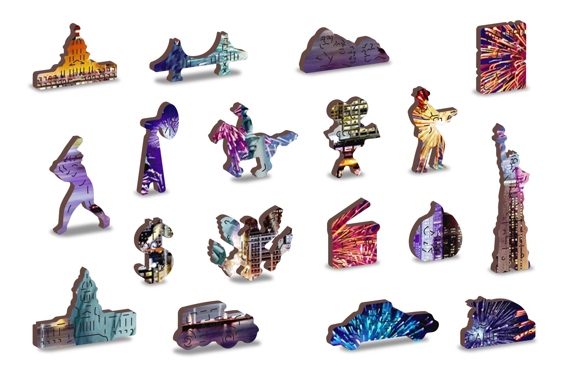 Plecați într-o aventură în New York-ul de Noapte cu puzzle-ul nostru de lux din lemn 2v1. Făcut cu grijă din material precis, acest puzzle oferă piese unice, tăiate în forme ce reprezintă animale, obiecte sau clădiri, și este, de asemenea, prietenos cu mediul.