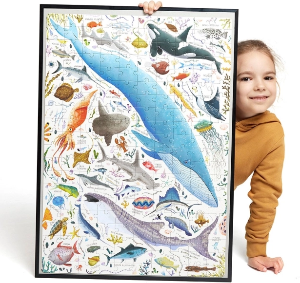 Cine trăiește în adâncurile mării? Ne-am scufundat în oceanul imaginației și al cunoștințelor marine și am ales o parte dintre creaturile fascinante. Am combinat ilustrații frumoase, teme captivante și am adăugat bucuria mare a asamblării. Rezultatul este un puzzle splendid din două sute de piese. Este o idee excelentă de cadou, un puzzle pentru copiii mai mari și adulți și perfect pentru asamblare în familie.