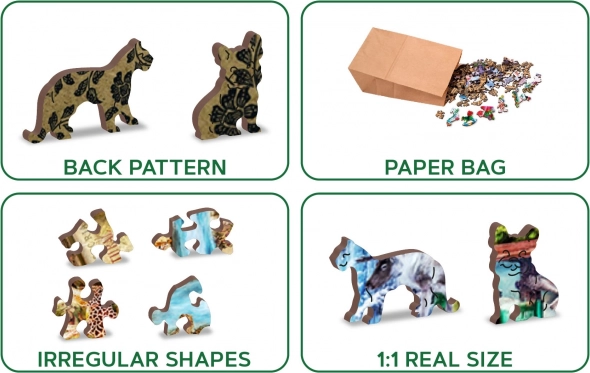 Puzzle-ul din lemn WOODEN CITY, decupat cu laser, cu piesele sale special modelate, este incredibil de distractiv. O parte dintre piese sunt realizate în forme de animale, clădiri sau obiecte, ale căror detalii evidențiate cu laser intensifică efectul final. Aceste piese pot sta singure ca figurine mici. Asamblarea puzzle-ului cu piese de forme diferite este mai dificilă și reprezintă o provocare mai mare decât asamblarea unui puzzle clasic. În plus, puzzle-ul este dublu față: îl puteți asambla după imagine (fața) sau după formă (verso cu model). Brandul WOODEN CITY, pe lângă conceptul unic de puzzle, nu uită de ecologie, de aceea la aceste produse nu veți găsi niciun ambalaj din plastic.