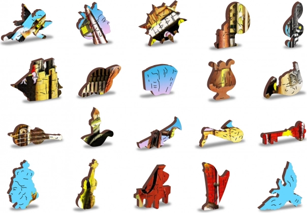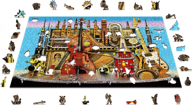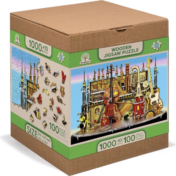 Acest puzzle din lemn premium aduce un motiv original al unui oraș muzical cu instrumente și turnuri, pe care îl vor îndrăgi atât adulții, cât și copiii curioși. Piesele sunt tăiate cu laser din placă HDF rezistentă (3–4 mm), au margini netede fără așchii, iar o parte dintre ele au forme speciale de animale, clădiri și obiecte. Datorită lor, asamblarea este mai dificilă, dar totodată extrem de distractivă și vizual impresionantă.