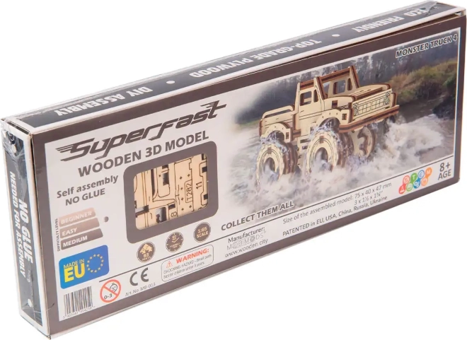 Modelul este inspirat de pick-up-urile americane iconice, iar pasionații de monster truck vor aprecia detaliile realiste ale roților și caroseriei. În plus, îl poți picta după propria imaginație pentru un aspect unic. Marca WOODEN CITY are grijă de planetă – ambalajul este complet fără plastic.
