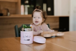 Termosul este fabricat din oțel inoxidabil de calitate și are o capacitate de 350 ml, dimensiune ideală pentru porții de copii. Se deschide și se închide ușor și închide ermetic pentru a preveni vărsarea conținutului. Datorită pereților dubli din oțel inoxidabil, băuturile rămân calde până la 12 ore și reci până la 24 de ore.