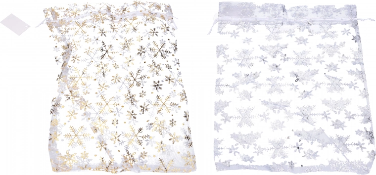 Acest săculeț din organza cu fulgi de zăpadă de Crăciun va adăuga cadourilor tale un aspect magic. Este ideal pentru sezonul sărbătorilor de iarnă, fie că împachetezi cadouri pentru cei dragi sau dorești să-l folosești ca decor.