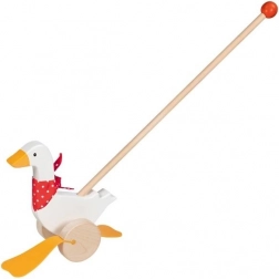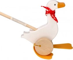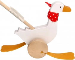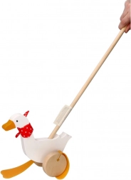 Gâsca pentru copii Berta, din lemn de calitate, încântă prin designul ei clasic cu eșarfă roșie cu buline și picioare „înotătoare” pronunțate, care se mișcă drăgălaș la împingere. Bețișorul lung facilitează ghidarea jucăriei și susține mișcarea activă a copiilor.