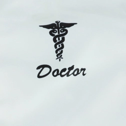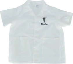 Halat medical alb cu mâneci scurte, două buzunare și simbolul Caduceus cu inscripția 'Doctor'.