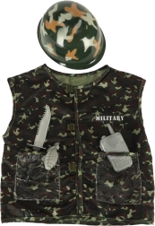 Cu acest costum militar, copilul tău se va simți ca un adevărat soldat. Costumul este compus din vestă de camuflaj și cască militară și este conceput pentru a rezista chiar și celor mai sălbatice jocuri.