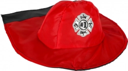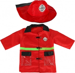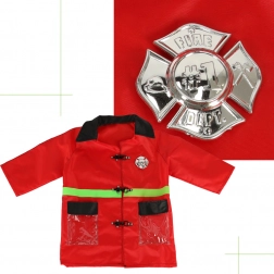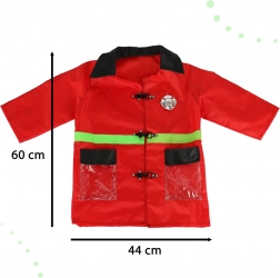 Costumul pentru copii include o jachetă concepută să arate ca o jachetă adevărată de pompier, datorită culorii roșii și elementelor reflectorizante verzi.
