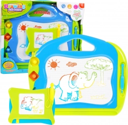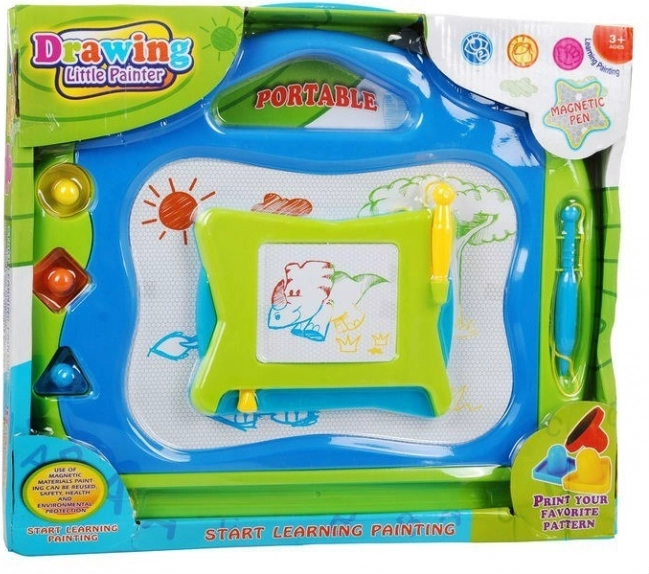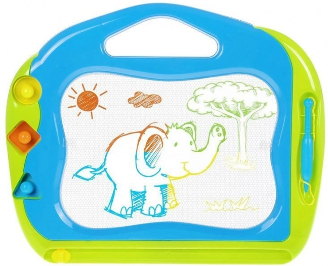 Acest set include o tablă magnetică mare cu suprafață de desen albă și fundal color integrat (roșu, verde, albastru, galben) și o tablă mică de călătorie gratuită. Cu ajutorul stiloului inclus și al celor trei ștampile (cerc, pătrat, triunghi), copiii pot crea imagini variate, exersa formele și dezvolta creativitatea.
