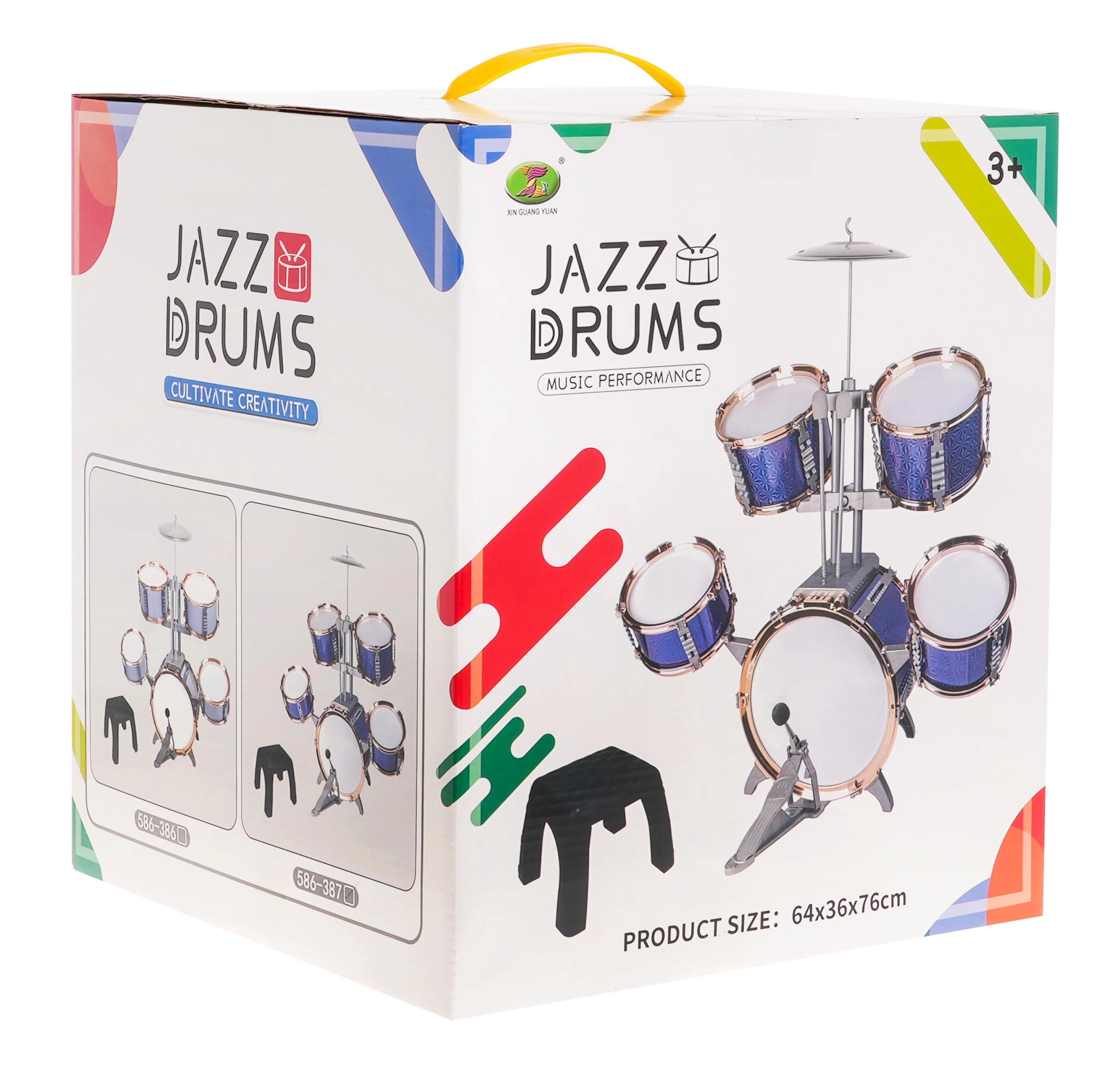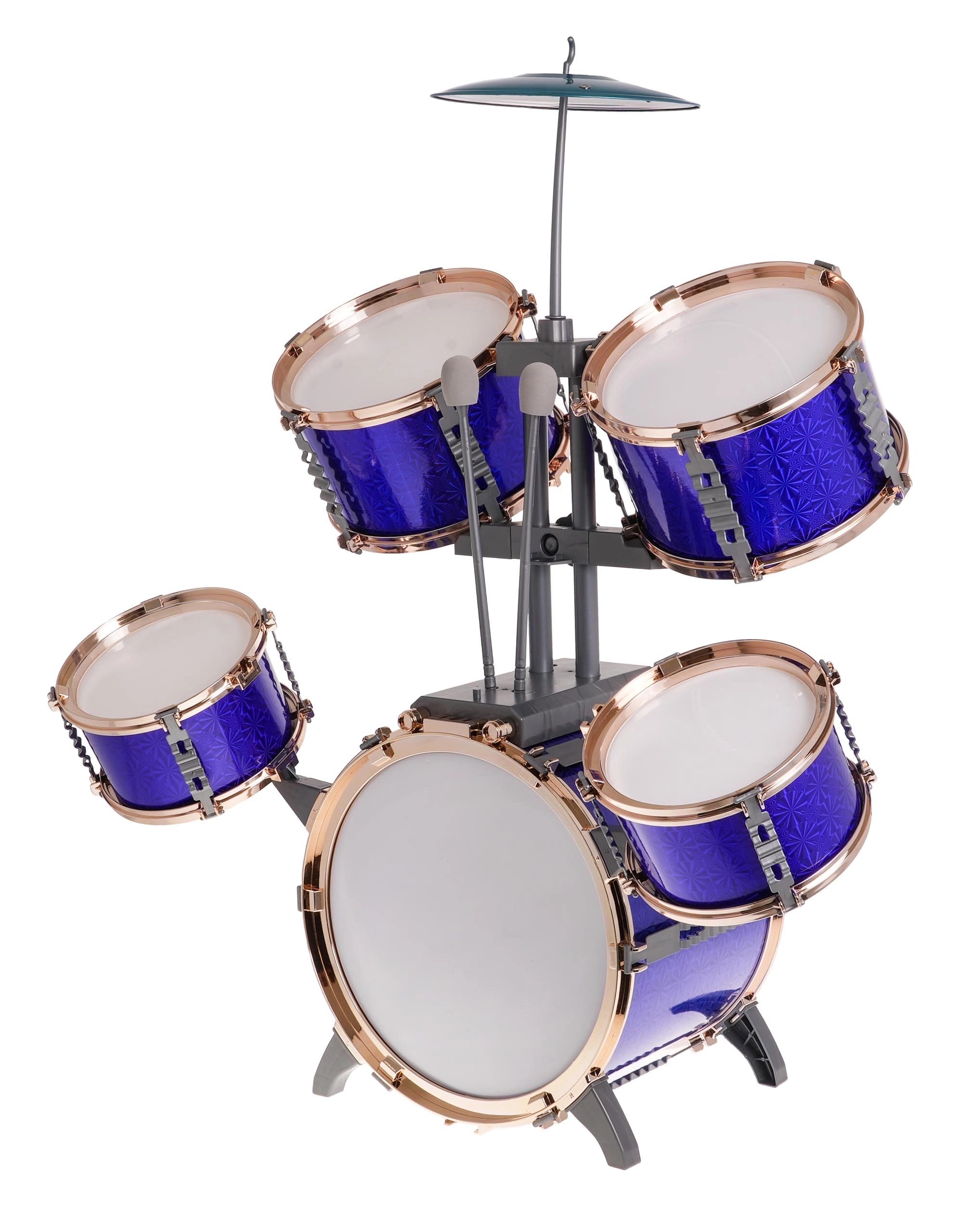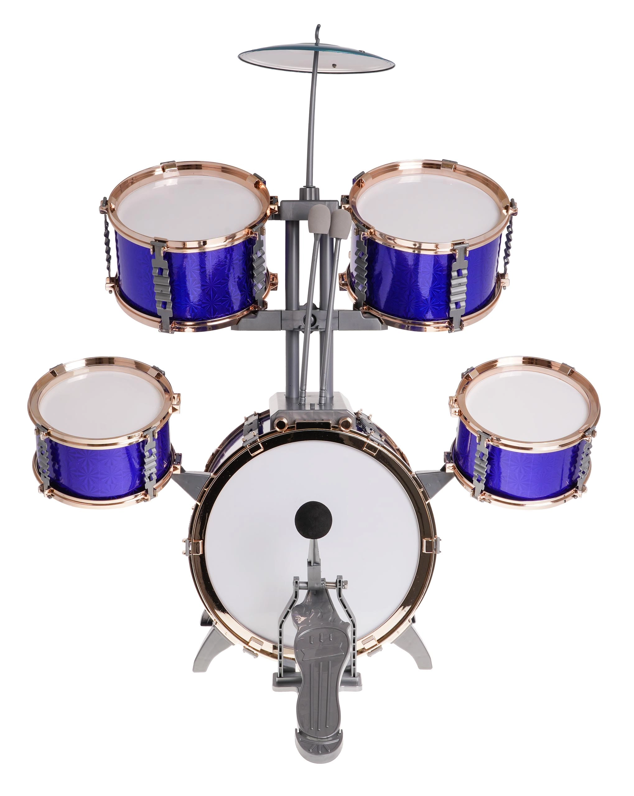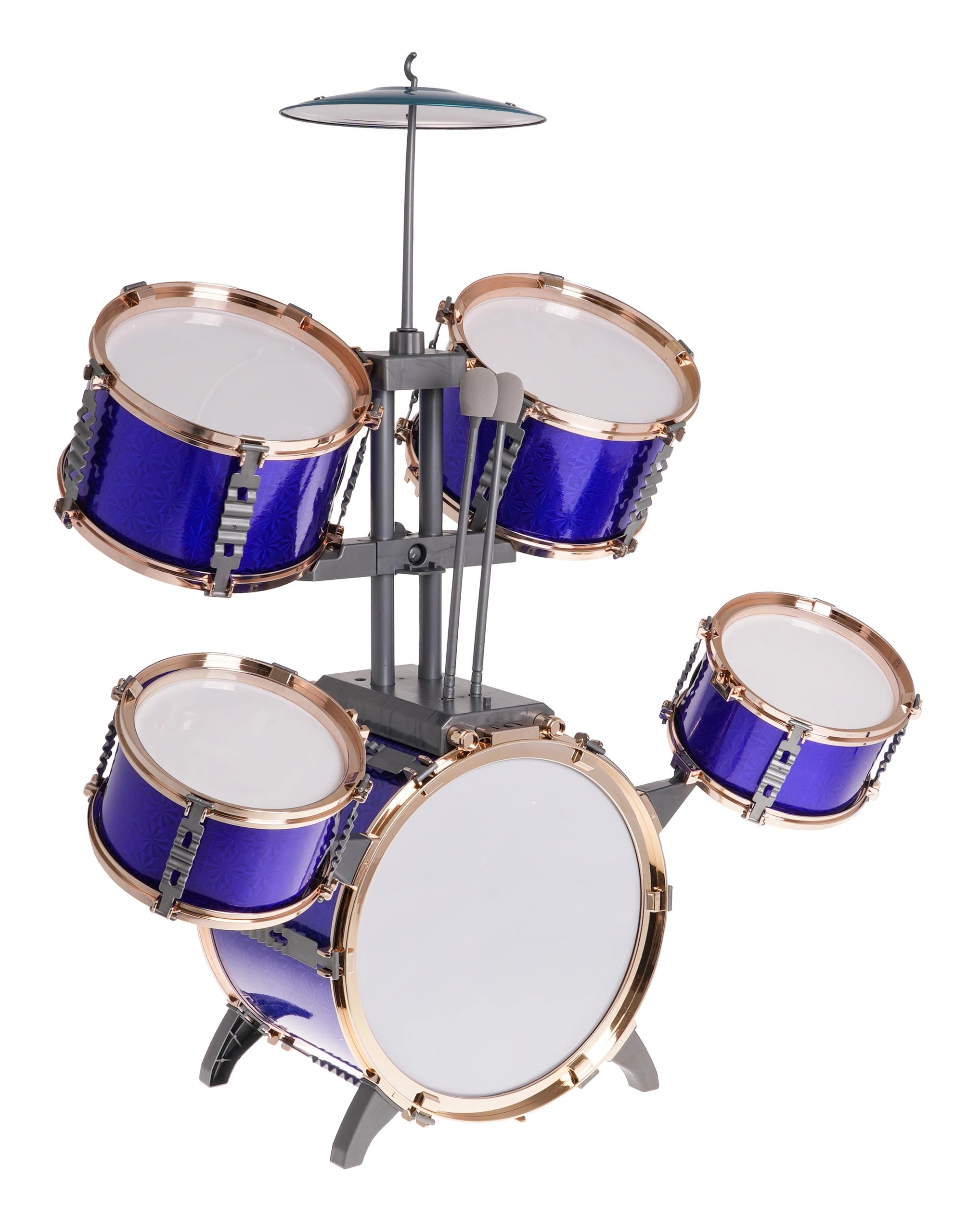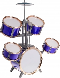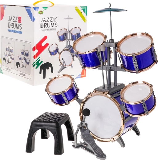 Marele set de tobe pentru copii, în culoare albastră, oferă celor de la 3 ani o intrare distractivă în lumea ritmului. Include 5 tobe, un cinel metalic, 2 bețe și un scăunel. Construcția stabilă și dimensiunile adaptate copiilor susțin dezvoltarea coordonării, simțului ritmic și jocul creativ.