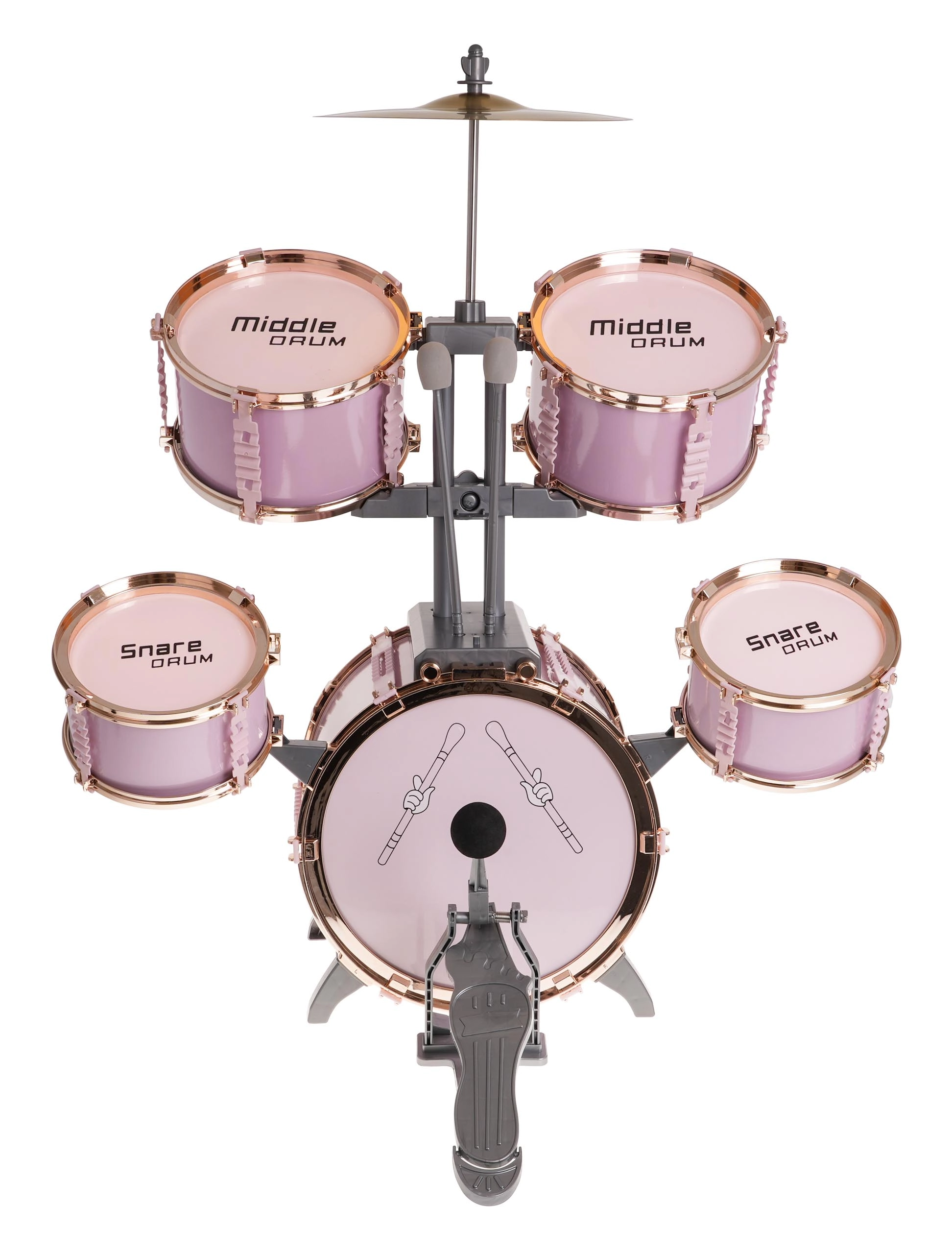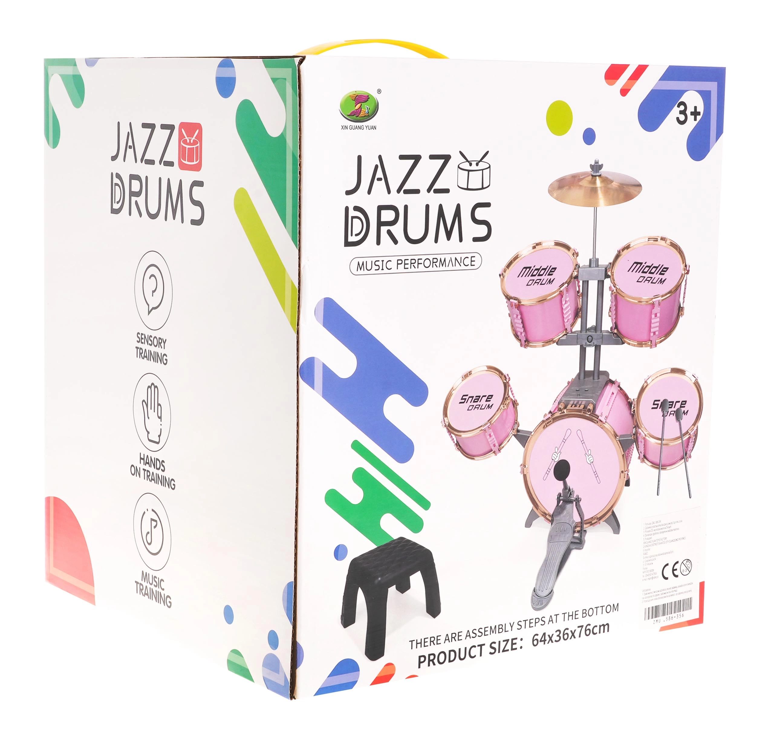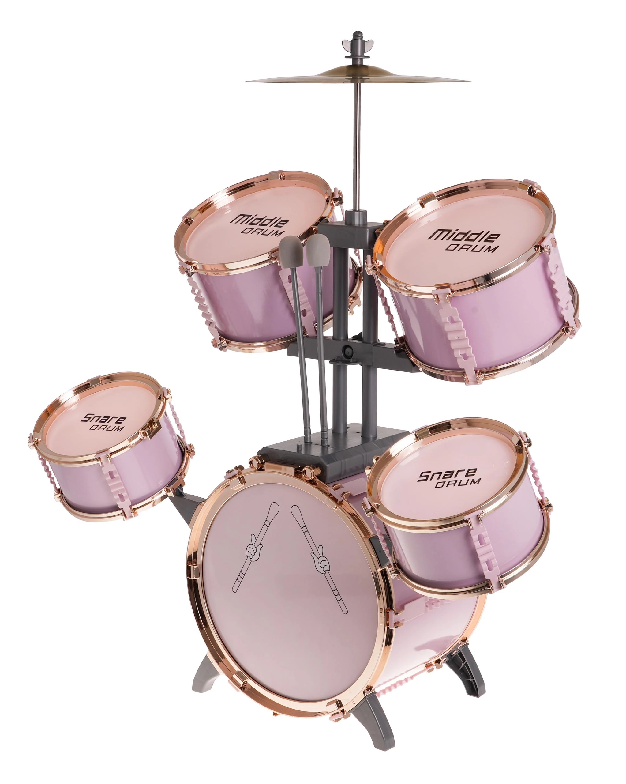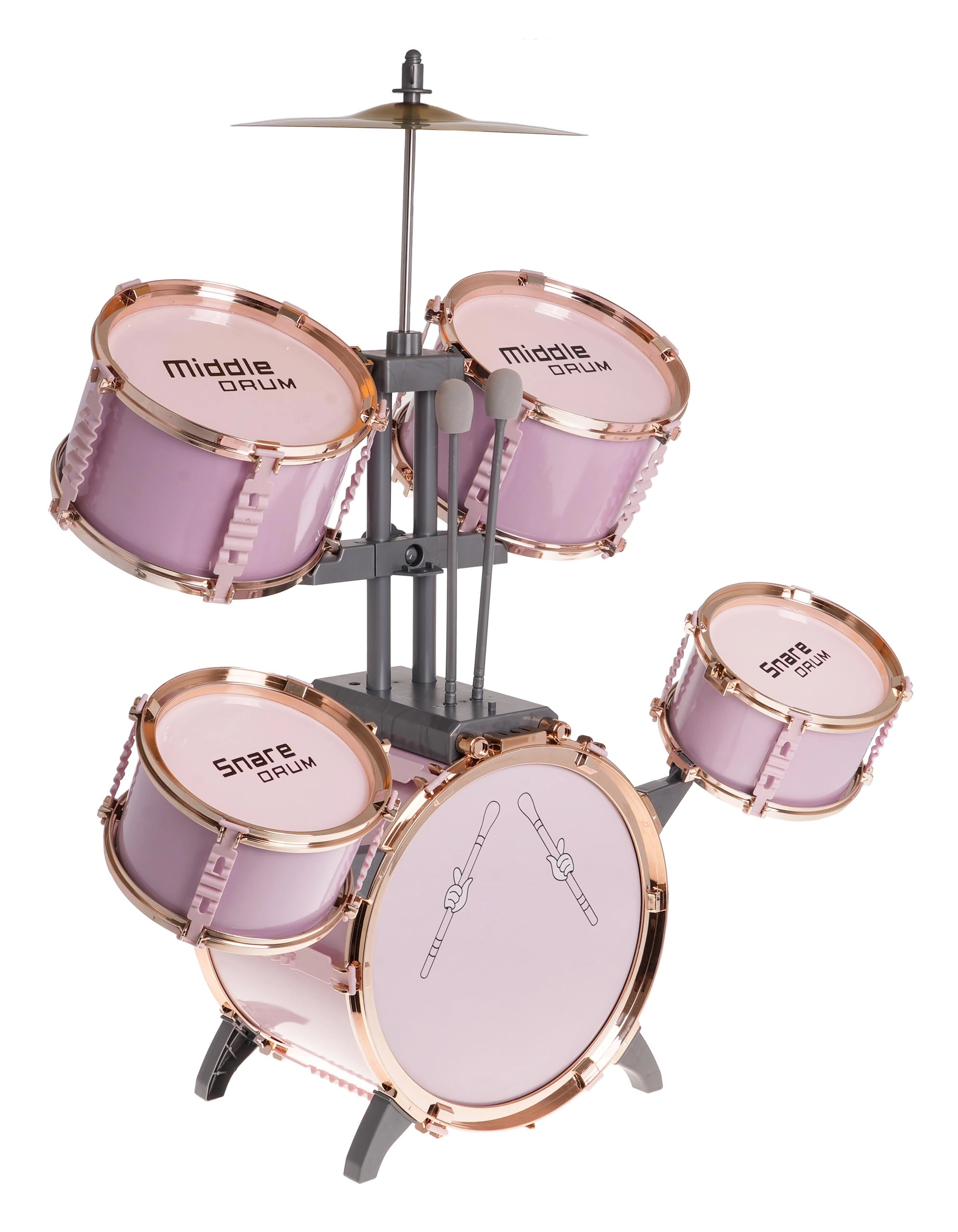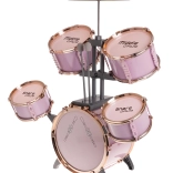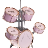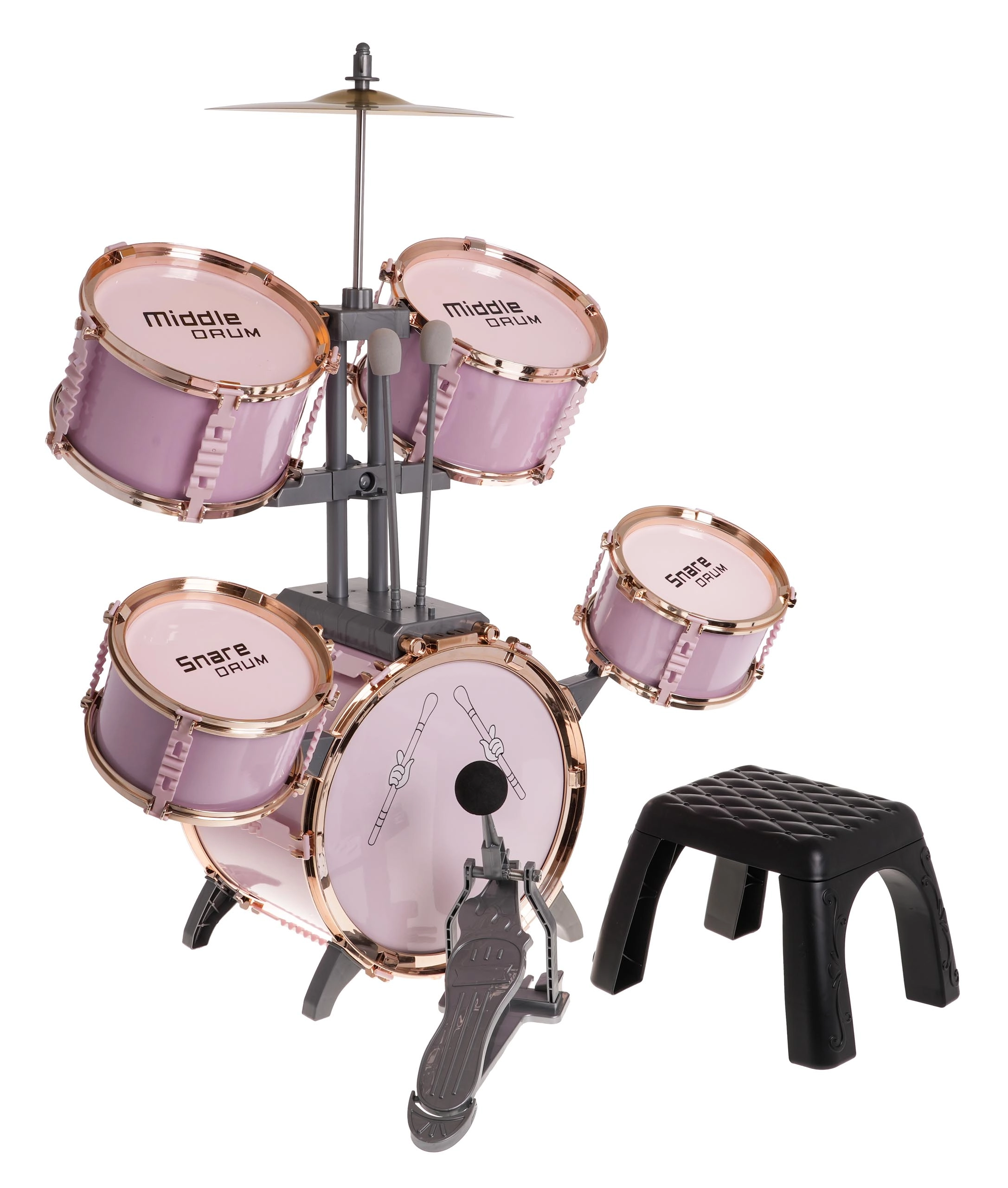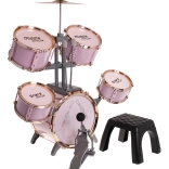 Set mare de tobe roz cu scăunel pentru copii de la 3 ani. Acest instrument muzical jucăuș nu doar îi încântă pe cei mici, ci îi introduce și în lumea muzicii și a ritmului.
